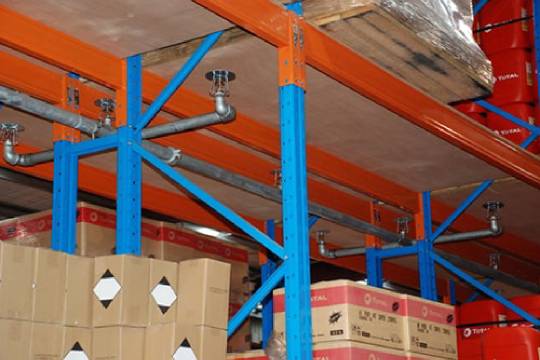 A sprinkler that is installed on a storage rack. A sprinkler equipped with integral shields to protect its operating elements from the discharge of the sprinklers installed at higher elevations. The water shield prevents wetting of the thermal sensing element by water from sprinklers at a higher elevation in the rack or at ceiling level. And when your facility houses high-hazard items, such as flammable liquids, paper or exposed plastics, it’s even more important.