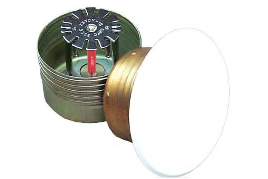 Concealed fire sprinklers are somewhat like pendent fire sprinklers; however, they’re located within the ceiling and they’re hidden by a cover plate. Once the cover plate is installed, you can’t see the concealed fire sprinkler at all. The cover plate will fall off at a temperature about 20 degrees lower than the fire sprinkler, allowing the deflector of the concealed sprinkler to drop and be exposed to the heat from the fire.