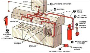 A fire needs three things to thrive: oxygen, heat, and fuel. Once the kitchen hood sprinkler system detects a fire, the nozzles above the appliance will discharge wet chemicals. These wet chemicals are engineered to quickly put out fires by covering the flames and starving them of oxygen.